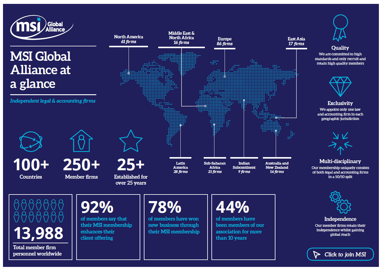 Η MSI αναπτύσσεται σταθερά για να γίνει ένας κορυφαίος, ηγετικός, διεθνής σύνδεσμος με πάνω από 250 ανεξάρτητες εταιρείες-μέλη σε περισσότερες από 100 χώρες της Αμερικής, της Ασίας-Ειρηνικού, της Ευρώπης, της Μέσης Ανατολής και της Αφρικής.